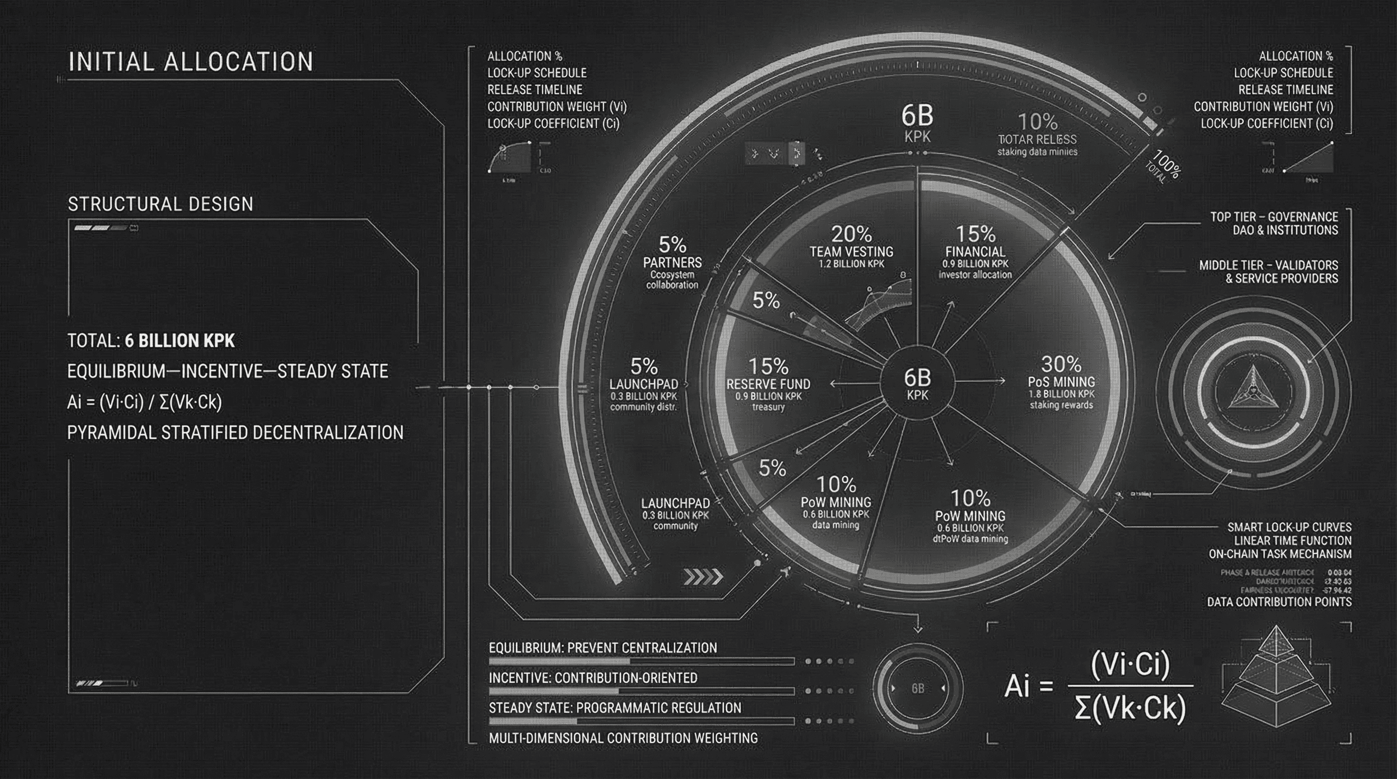 The initial allocation of the KPK token is engineered to balance early-stage ecosystem incentives with long-term macroeconomic stability, adhering to the tri-fold principle of "Equilibrium—Incentive—Steady State."