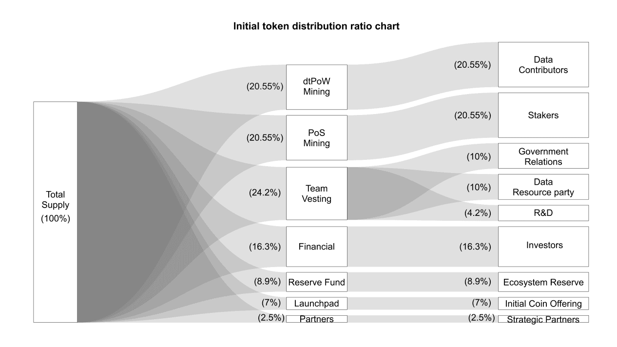 The tokenomics framework introduces a "multi-dimensional contribution-weighted allocation" principle. This design allows capital investment, technical development, and data generation to be mutually balanced within the token economy. The programmatic logic for minting, issuance, and allocation is defined by the following equation: