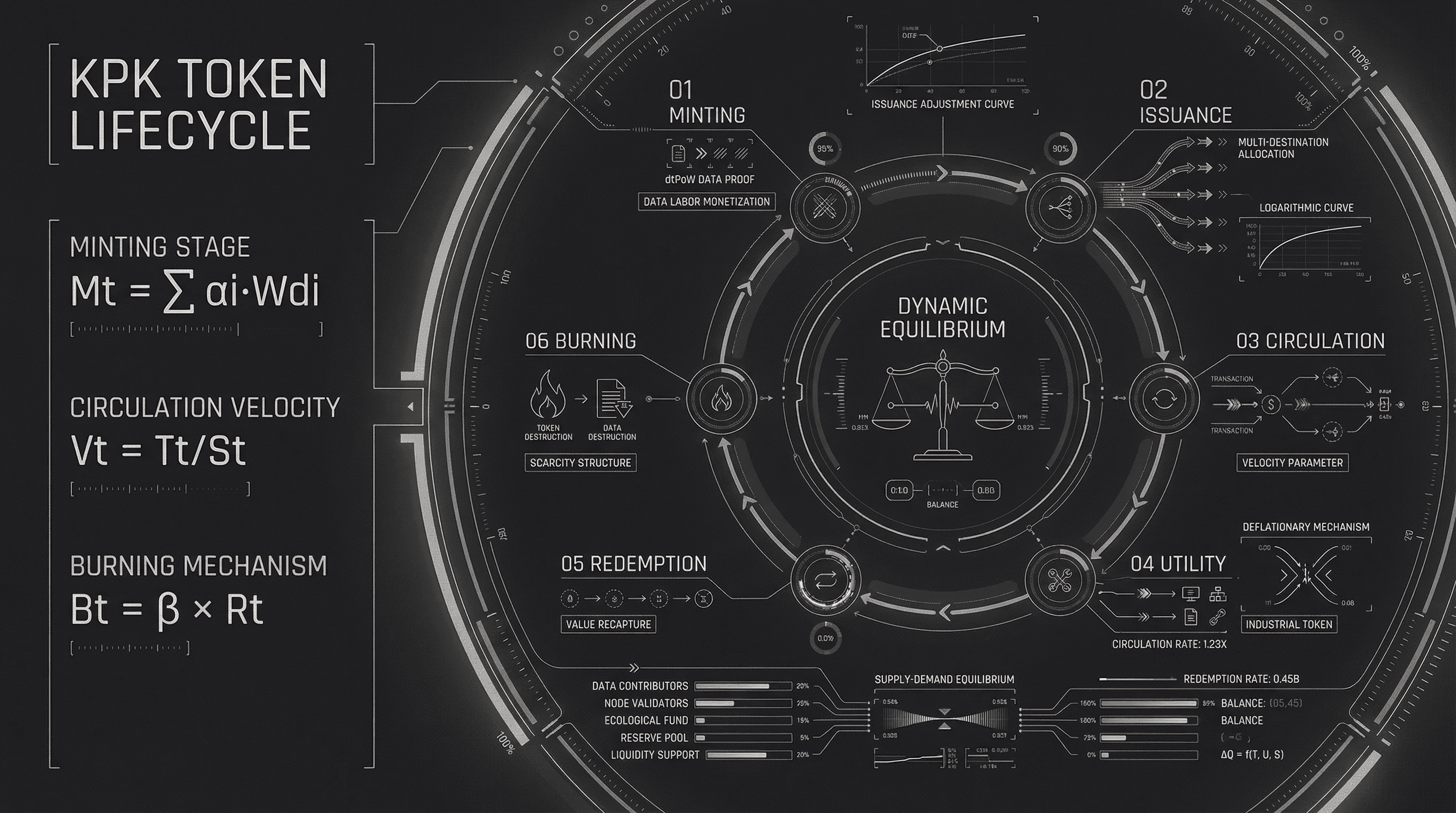 The creation of KPK tokens relies entirely on the Data-based Proof of Work (dtPoW) mechanism. When verified real-world industry data (such as vehicle usage, charging records, and energy consumption) is submitted to the network, authoritative nodes calculate its economic weight. Upon approval, an equivalent amount of KPK is minted. This process fundamentally acts as the "monetization of data labor."