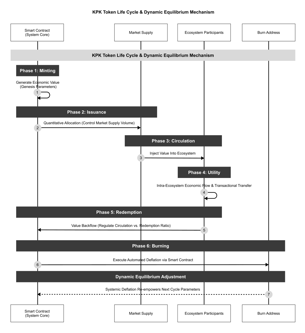 The KPK Token Lifecycle Model is designed as a continuous, dynamic closed-loop system. It ensures the sustainable flow of economic energy by transitioning the token through five distinct stages—from data-driven generation to automated deflation. This structure guarantees that the token's circulation and redemption rates remain perfectly balanced via smart contract regulation.