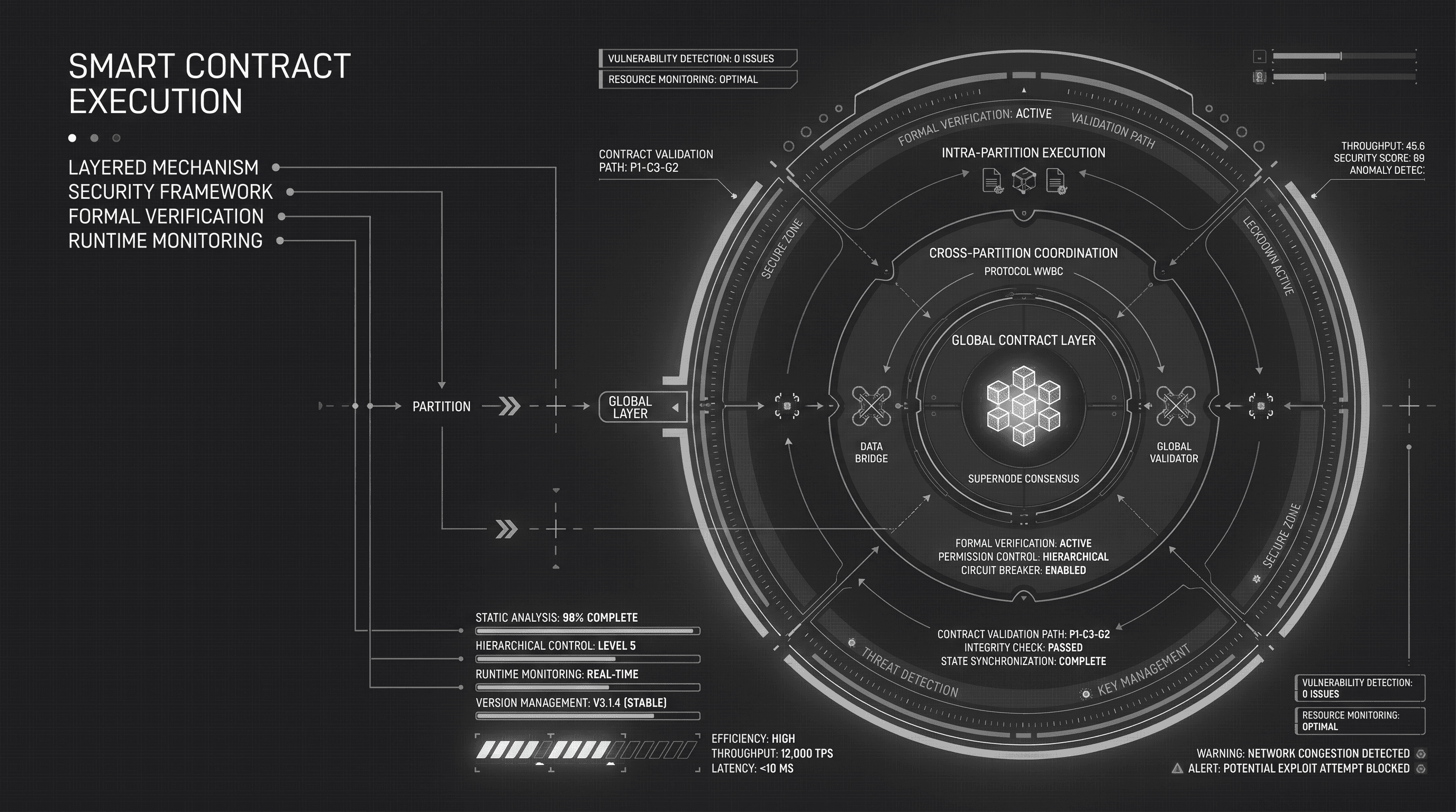 Hierarchical Access Control: Contracts operate under differentiated permission frameworks. Only authorized nodes or specific partitions can invoke critical functions, drastically reducing the attack surface.